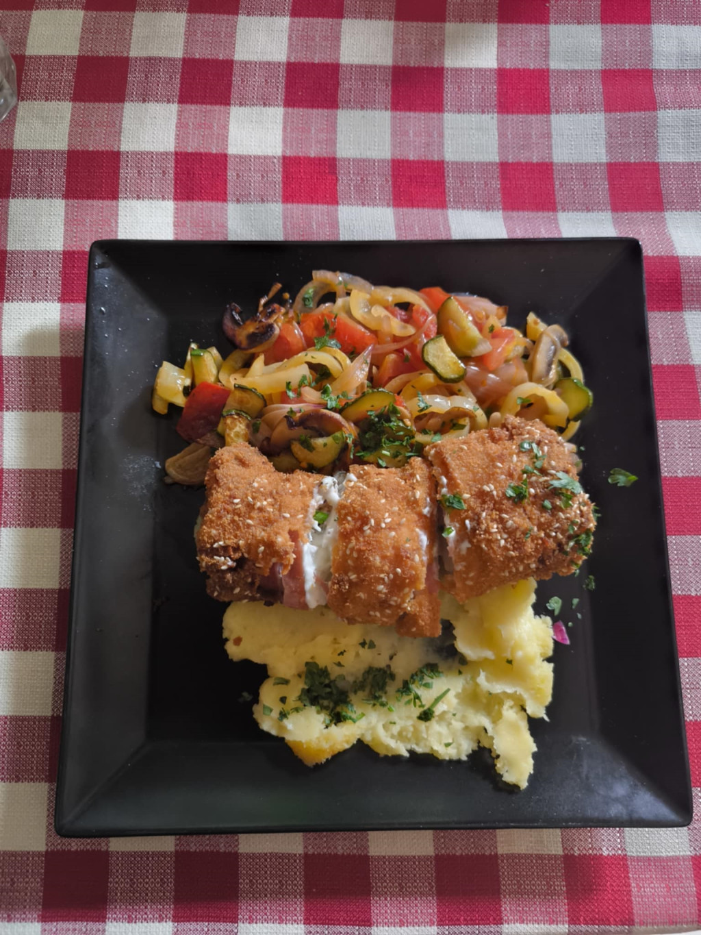 Baconnel bazsalikomos sajtkrémmel töltött sertés borda szezámmagos bundában pürével és grillzöldséggel