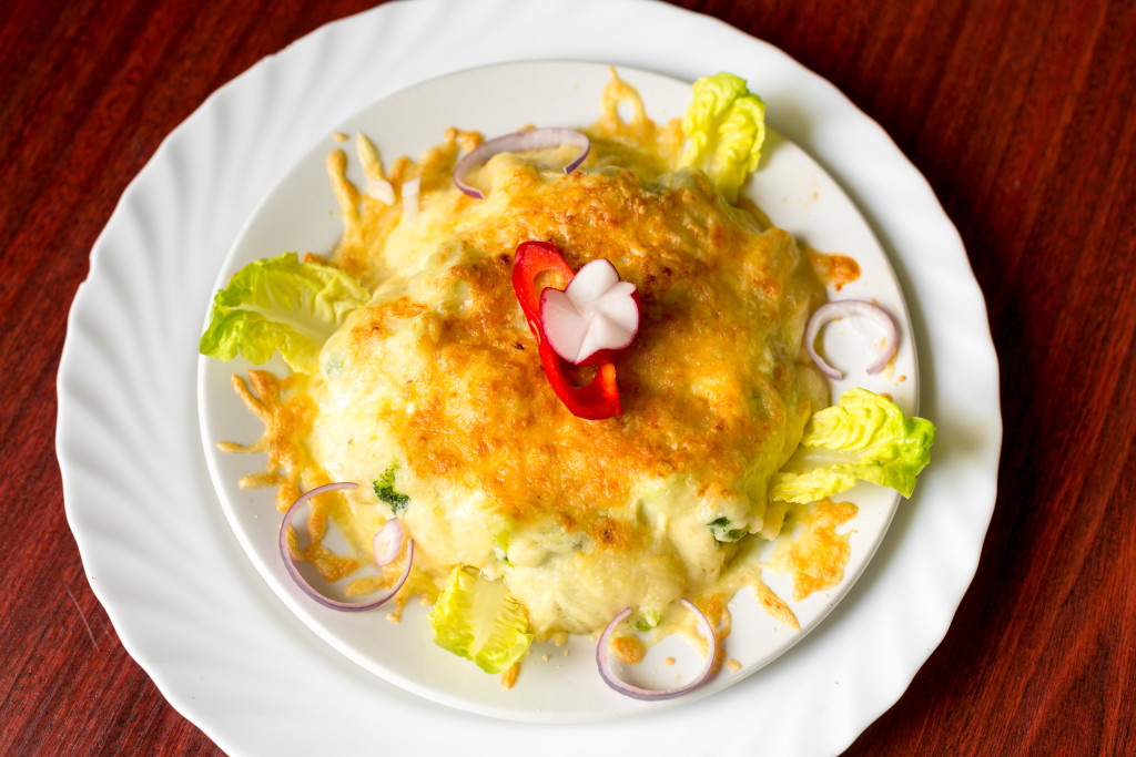 Sajttal grillezett csirkemell paradicsommal, baconnel, hagymával szarvasgombás burgonyapürével